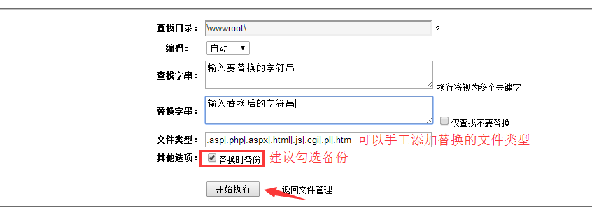 输入替换字符串以后执行,建议勾选备份,以免出现问题可以还原。可以手工添加要替换的文本文件类型。