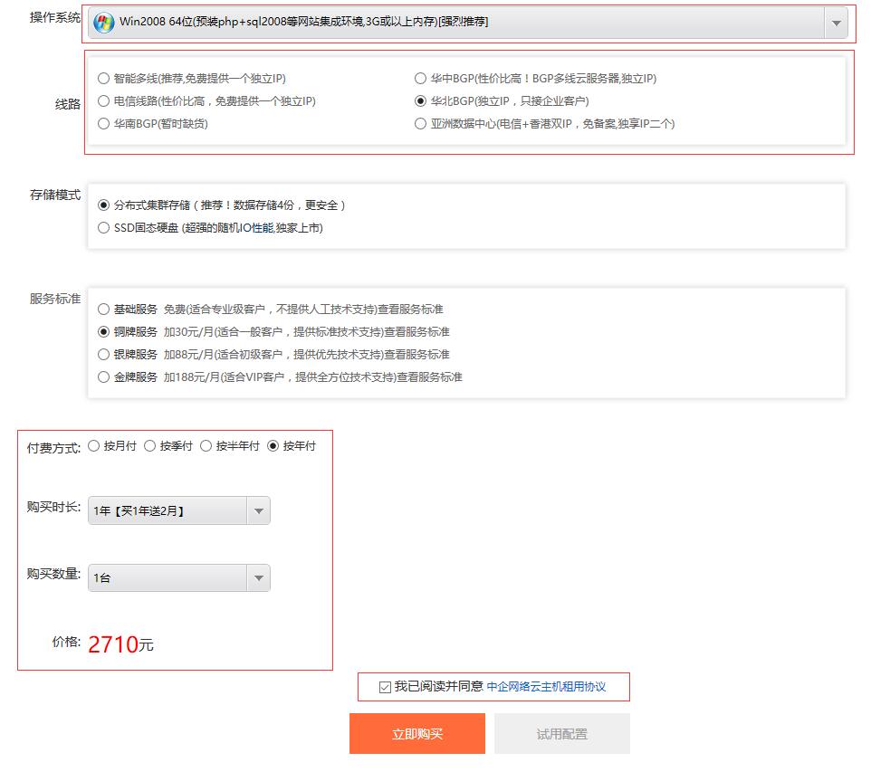 在选择好配置之后,勾选中企网络云主机租用协议,然后点击购买这个配置。